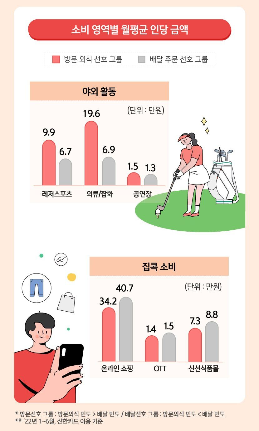 외식영영은 방문, 배달 선호유형마다 개인의 소비 성향차이도 있는데요. 방문외식을 선호하는 그룹은 레저스포츠나 공연같은 야외활동 중심의 액티브한 영역에서 지출이 많았습니다. 배달을 선호하는 유형은 온라인 쇼핑, OTT을 하는 집콕 소비가 대표적으로 많았습니다.