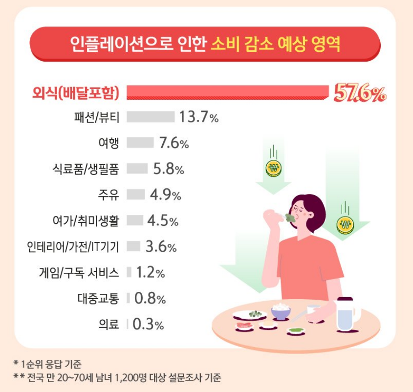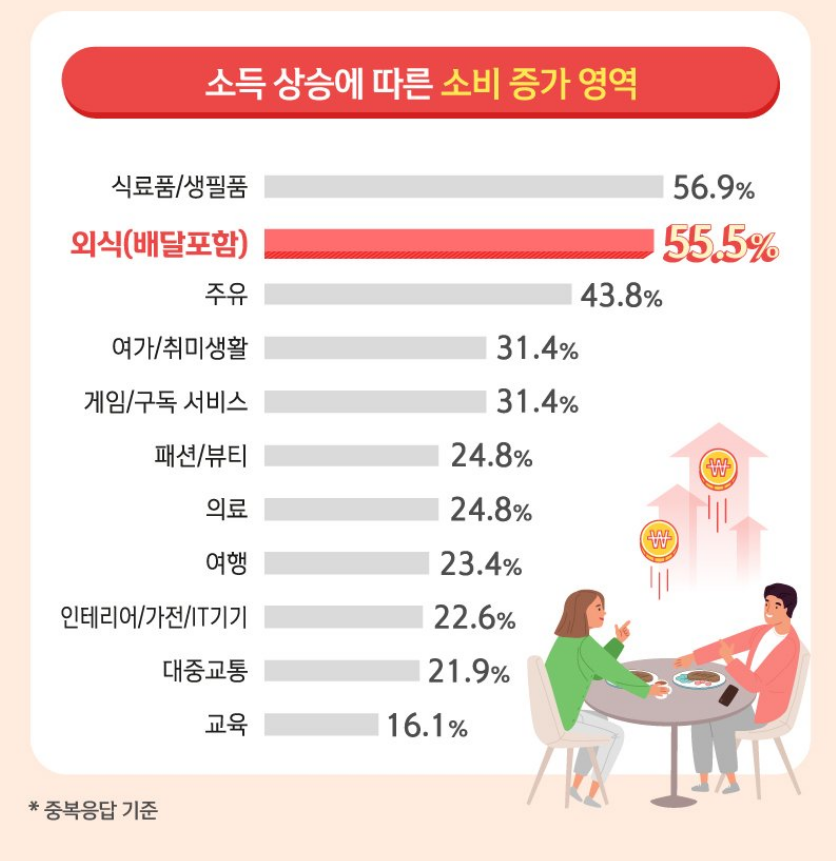 소득이 증가하면서 소비가 많았던 영역이나 물가상을에 따른 지출을 줄이른 것도 외식이 가장 많은 것으로 나타났는데요. 우리 생활과 가장 밀접하면서 거창한 계획이 없어도 기분내기 좋은 반면 집밥이라는 대체재가 있기 때문에 마음만 먹으면 지출을 줄일 수 있기 때문이지 않을까 생각됩니다.